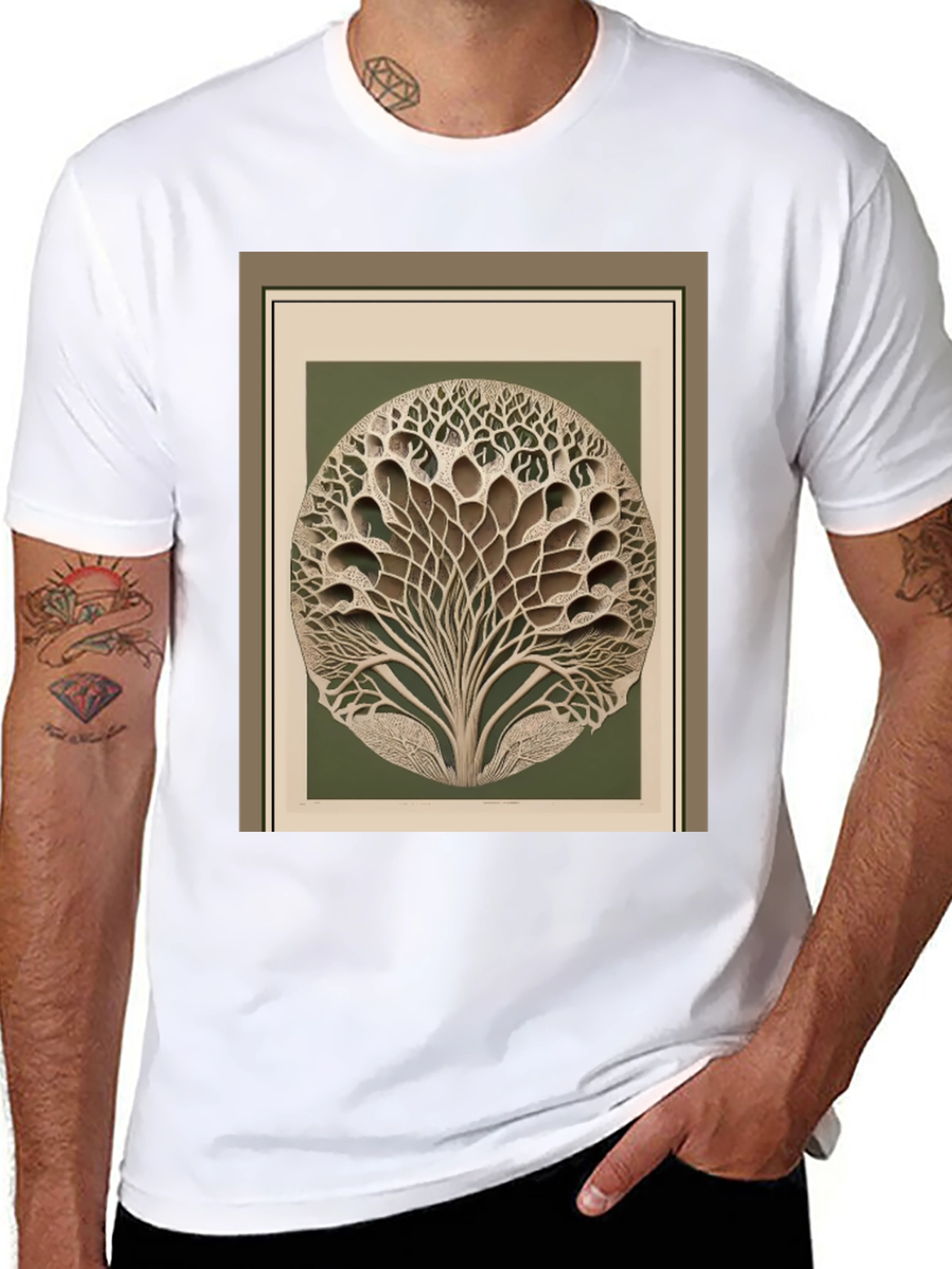 Showcase your unique style with this eye-catching black t-shirt featuring an abstract tree graphic. The design presents a captivating visual, blending earthy tones with intricate tree-like patterns in a circle frame, for a modern yet nature-inspired aesthetic. Made from comfortable, breathable fabric, this tee is perfect for everyday wear. Whether you're dressing up for a casual outing or relaxing at home, this shirt adds a touch of artistic flair to any ensemble. A perfect way to make a statement.