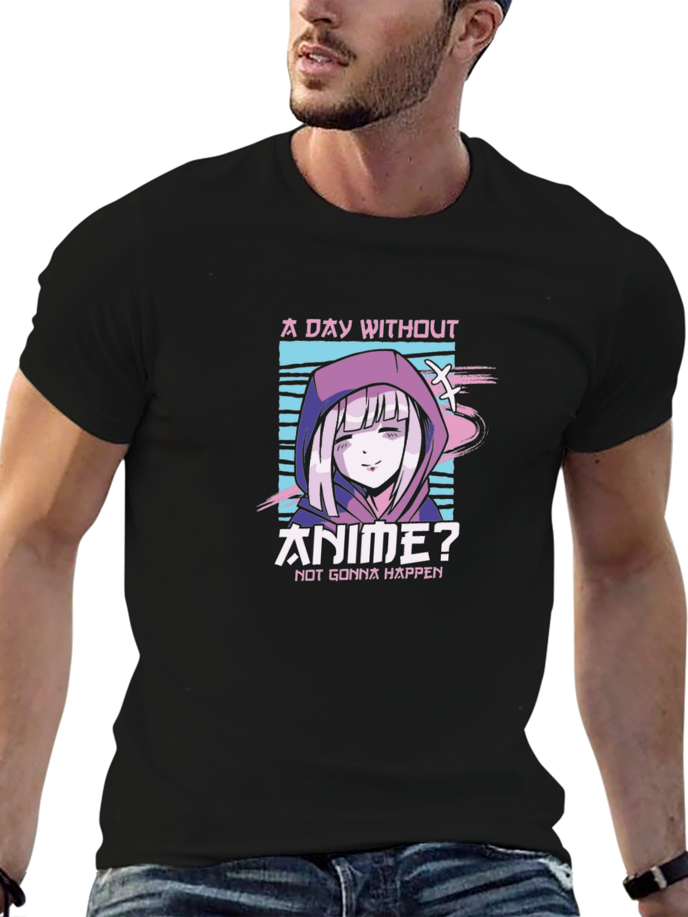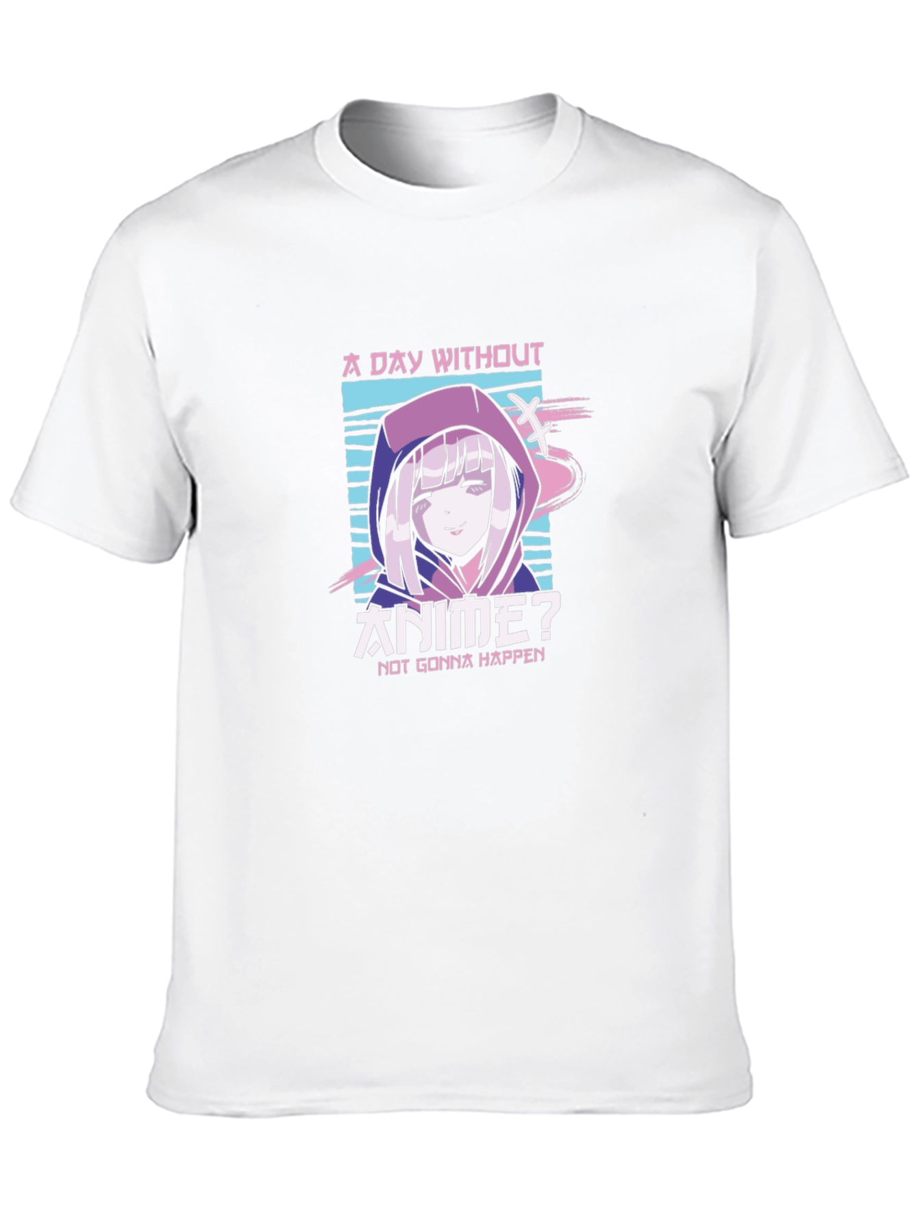 Show off your love for anime with this stylish black t-shirt! This tee features a vibrant, eye-catching graphic of an anime character with a hooded top and the text "A Day Without Anime? NOT GONNA HAPPEN." The design incorporates shades of purple, pink, and blue, creating a visually appealing contrast against the black fabric. Perfect for casual wear, anime conventions, or as a gift for the anime enthusiast in your life. Express your passion with this comfortable and expressive t-shirt.