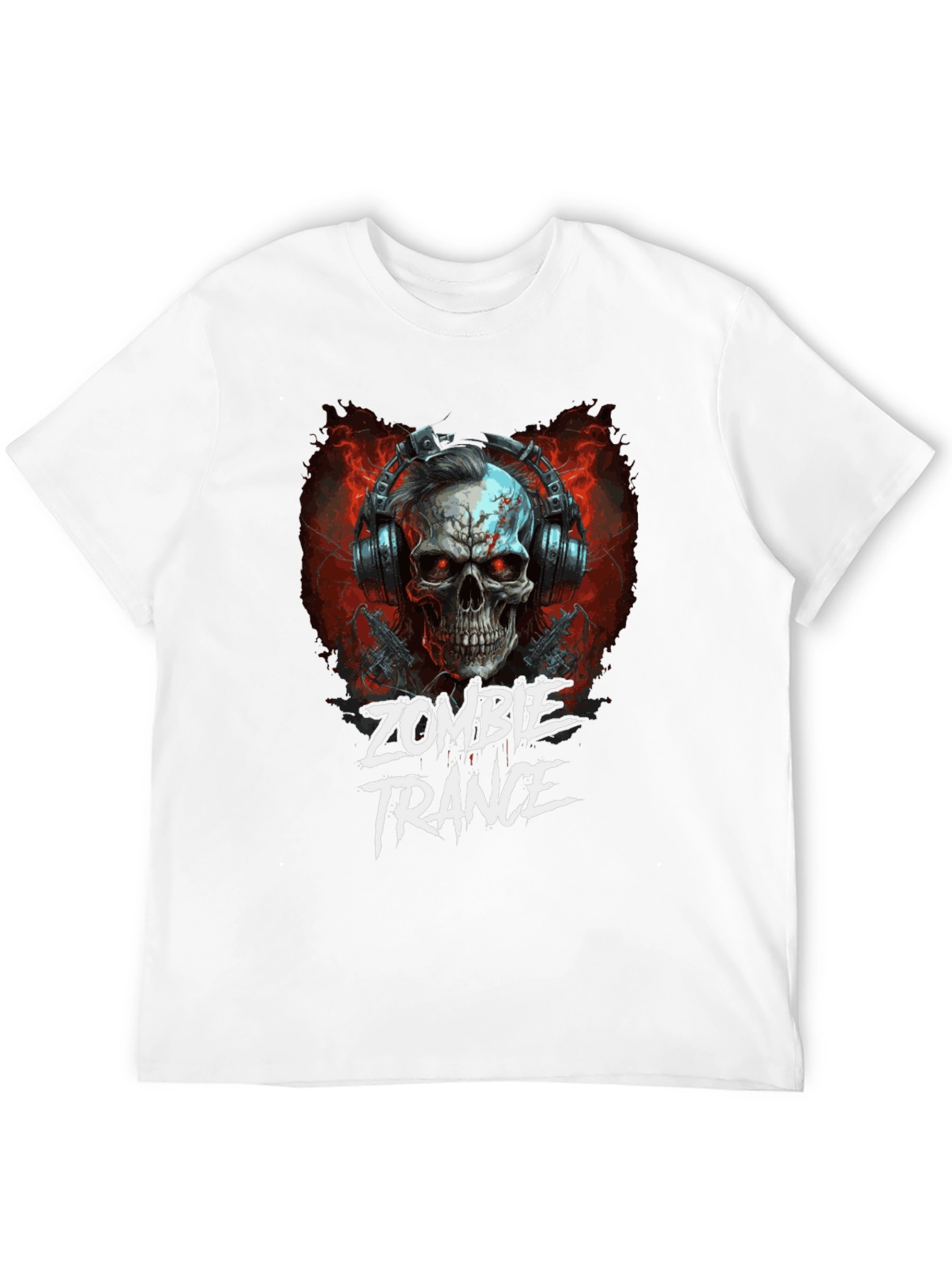 Unleash your inner rebel with this edgy Zombie Trance graphic t-shirt. The design features a skull wearing headphones with glowing red eyes, flanked by guns, set against a backdrop of fiery red accents. Bold 'Zombie Trance' text adds to the dark humor vibe. Made from a soft, comfortable fabric, this black tee offers a relaxed fit perfect for casual wear. Ideal for music lovers, zombie enthusiasts, or anyone with a taste for unique graphic apparel. Stand out from the crowd and make a statement with this killer tee.
